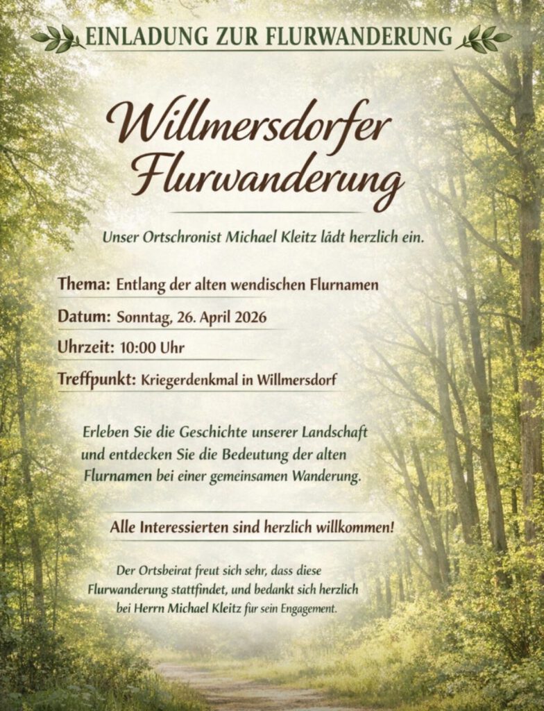 Am heutigen Sonntag 26.04.2026 lud Michael Kleitz zur gemeinsame Flurwanderung rund um Willmersdorf ein. Die Interessierten trafen sich um 10 Uhr am Denkmal in Willmersdorf, wo eine kleine Einführung und der Ablauf besprochen wurde.